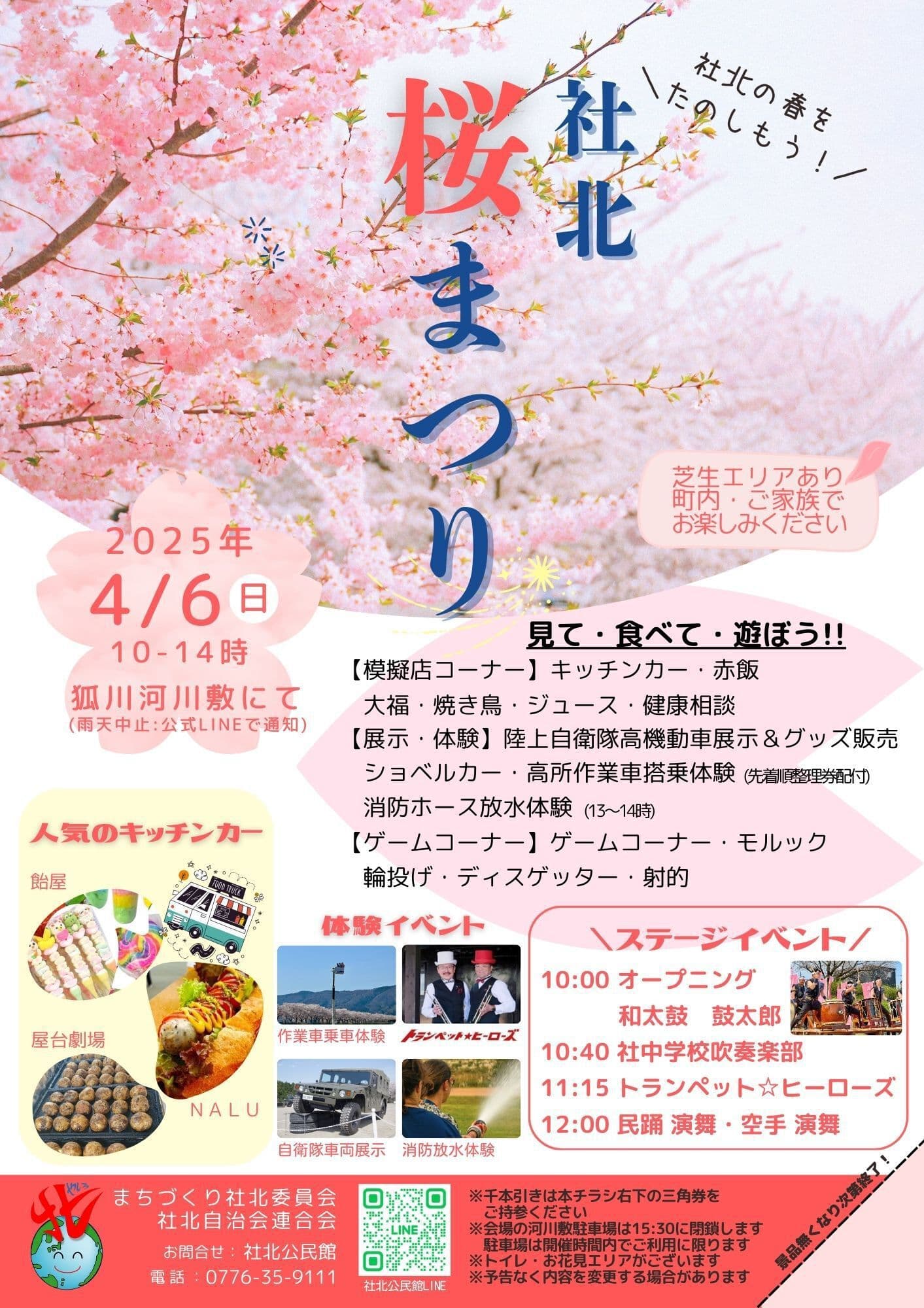 社北 桜まつり 地域イベントTOP 桜まつり あるこっさ社北 イルミネーション 地区敬老会 オープンカレッジ 社北 桜まつり 2025桜まつりは天候悪化の予報が出ていますので中止とさせて頂きました。 日時:4月6日(日)10:30~14:00 雨天中止場所:狐川河川敷 いこいの広場 駐車場・トイレ・お花見スペースあります。 昨年の桜まつりの様子 ,f75f8778-385a-412f-ab2e-f61ecda8339e,,{"tempId":"gdefault","gmapWidth":"100","gmapWidthUnit":"%","gmapHeight":"450","gmapHeightUnit":"px","gmapZoomLevel":17,"gmapScrollWheel":true} お問い合せ アクセス