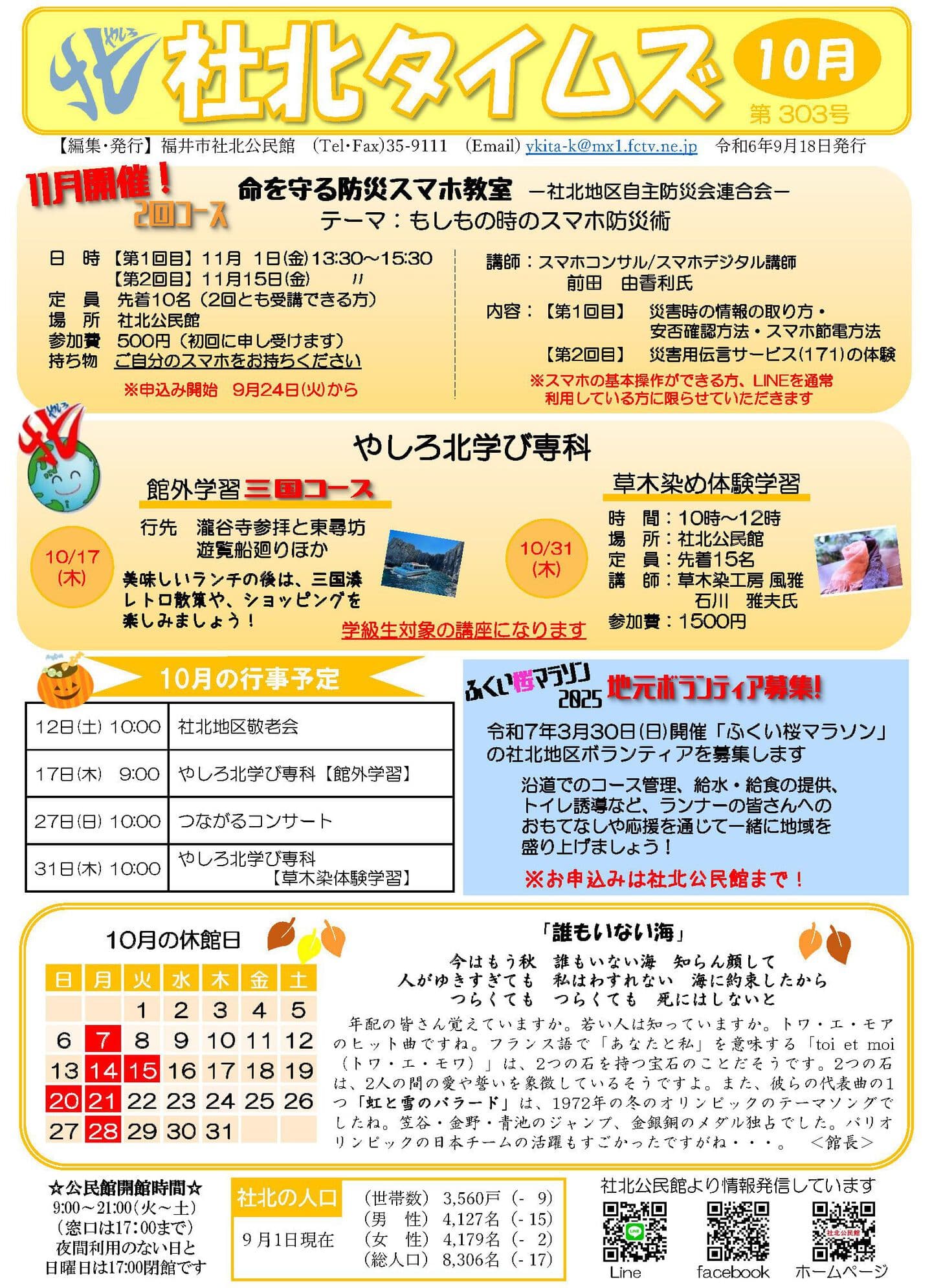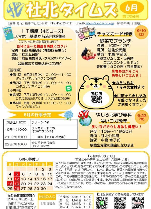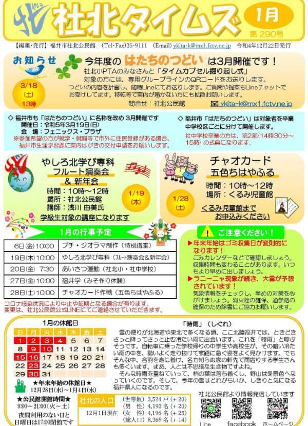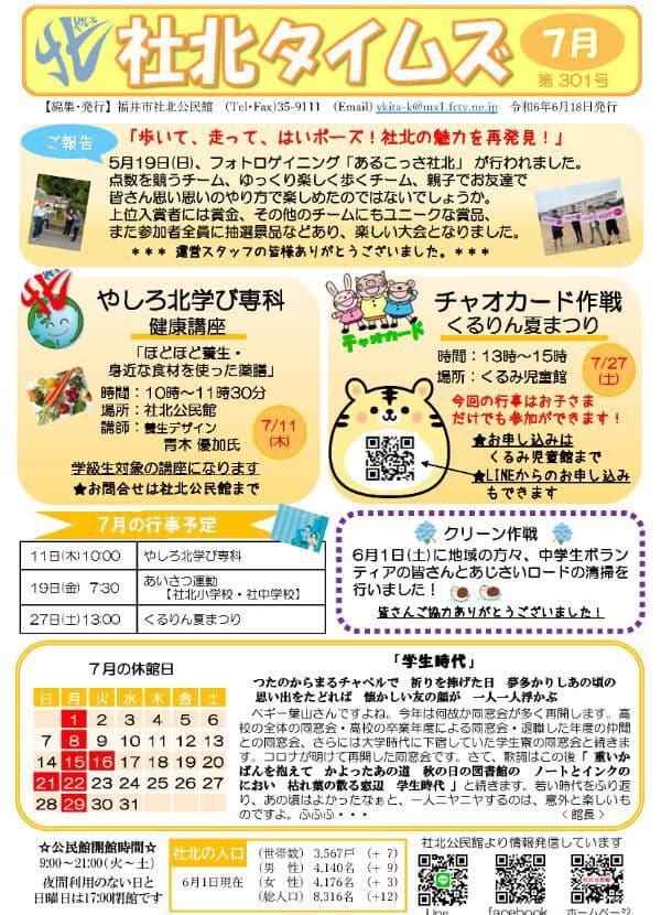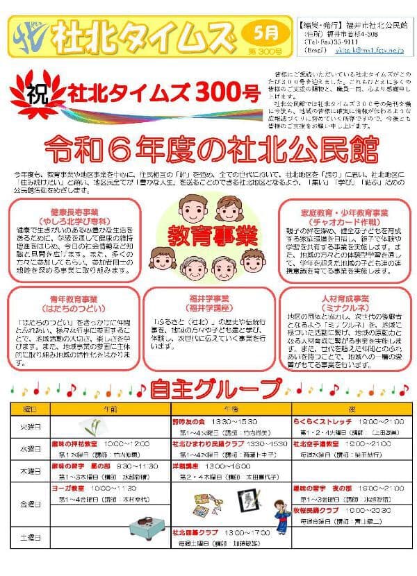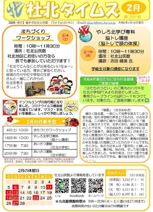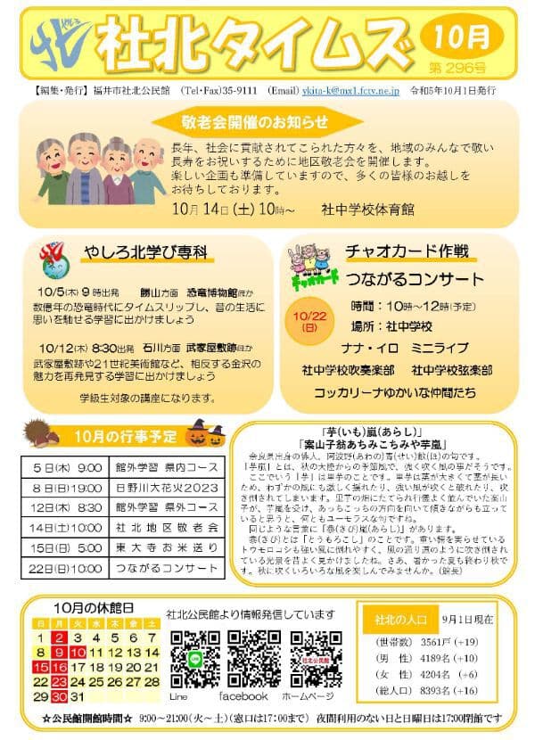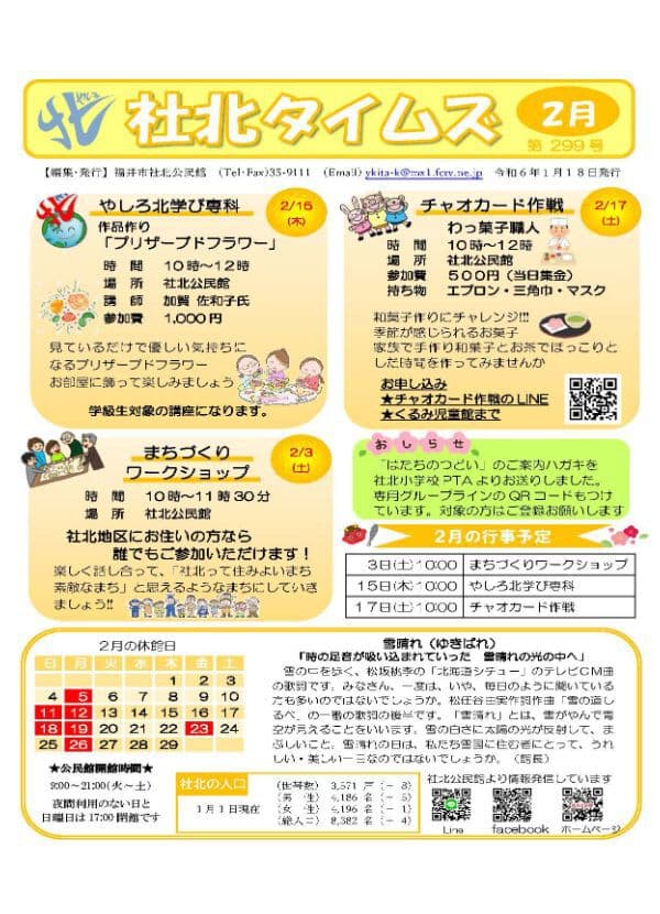 社北公民館では、学級活動、自主グループなどの生涯学習の情報や地区イベント、まちづくりの地区事業の情報を定期的に地域に発信しています。