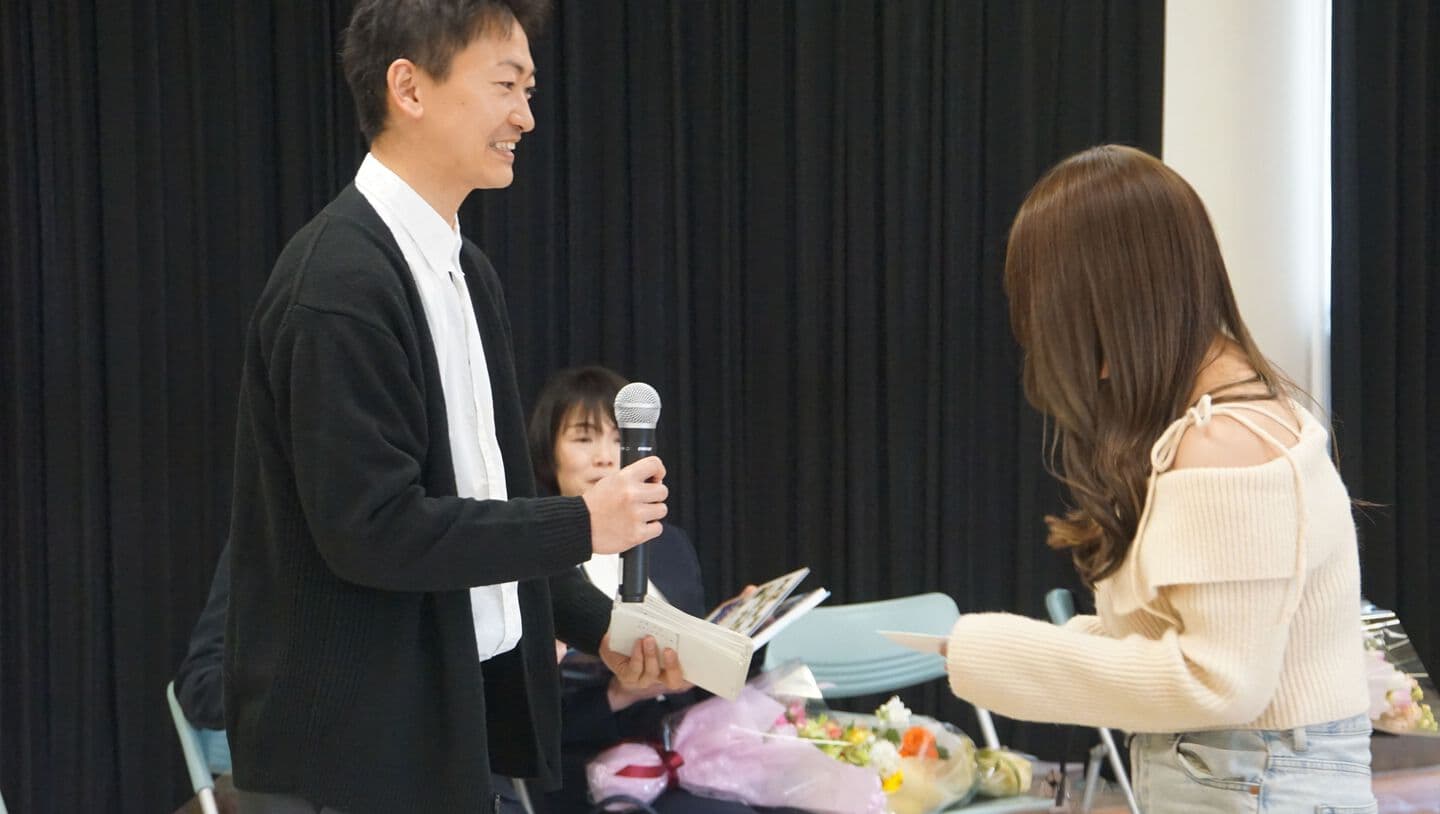 お土産には今日の写真をパネルにしたものと、当時の給食で食べたお米のムースを持って帰っていただきました。
